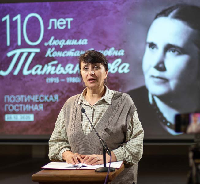 Ведущие кратко обрисовали жизненный путь поэта, а затем участники вечера зачитывали её стихи. Поэзия Людмилы Татьяничевой охватывает широкий круг жизни: любовь к родине, семейные ценности, красота русской природы, нравственные истины. Мир в её стихах предстаёт как сотрудничество многих людей, совместно создающих общую гармонию своей страны. Выступила на встрече и Ирина Сыроквашина, родственница Кожевниковых – приёмных родителей Людмилы Татьяничевой.